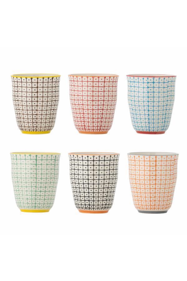 The Carla Cup by Bloomingville is a set of six stoneware cups featuring a cheerful and colourful design. Each cup is decorated with a grid of squares and dots in warm and vivid tones, brought together by handpainted details. The playful motif creates a vibrant expression, perfect for adding charm to any setting.