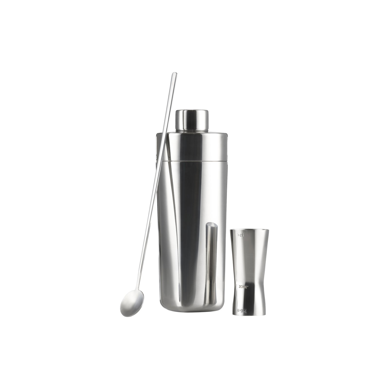 The bar set consists of Rocks shaker 400 ml, jigger 2.5/5 cl and cocktail spoon, all in stainless steel.