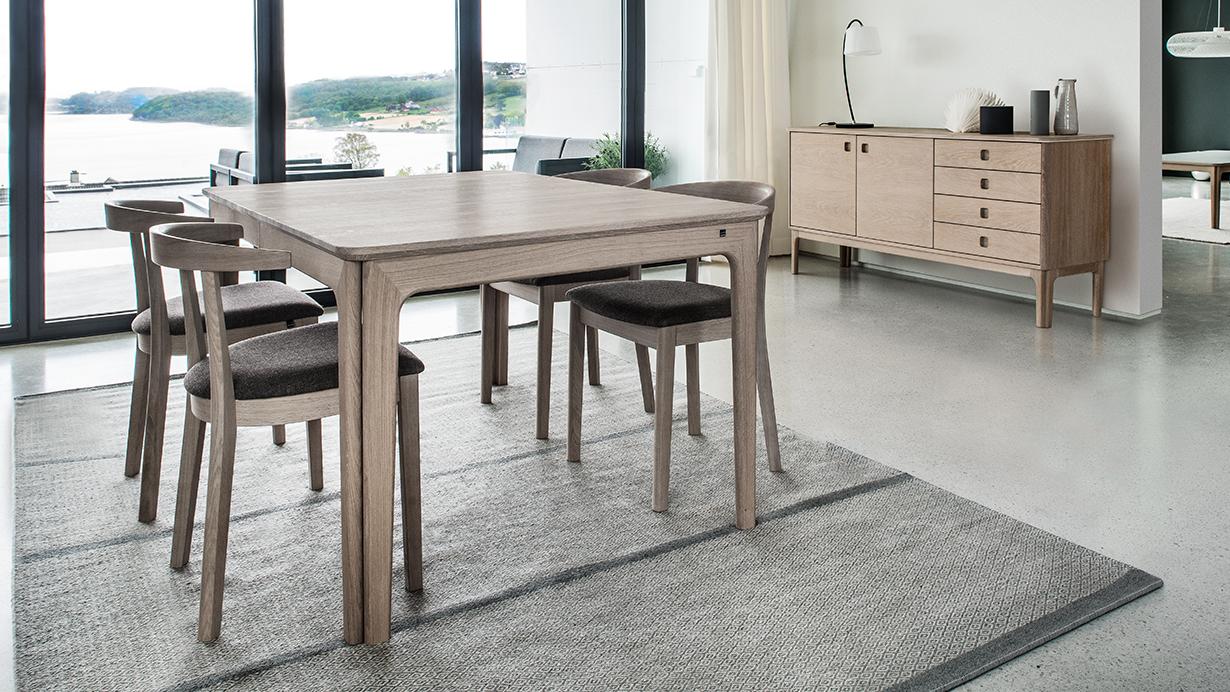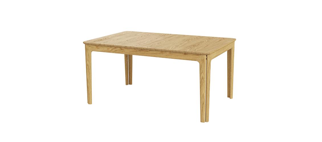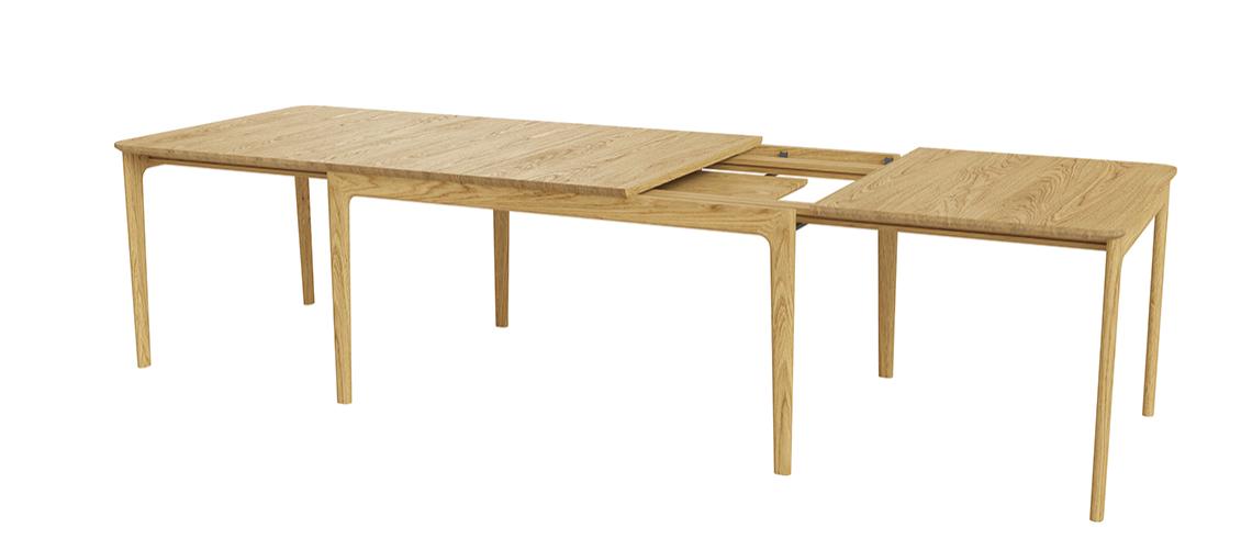 In its basic position the table has room for six people, and it is available in several wood sorts and laminate tops. The design is retro inspired, while the rounded corners of the tabletop and the double legs provide a more modern expression. The proportions are well-balanced and give the table a pleasing visual tranquility.